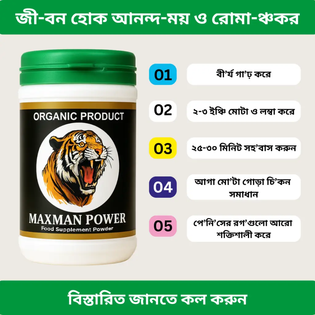 স্ত্রীর কাছে লজ্জিত, বিবাহিত জীবনে অশান্তি, মিলনে তৃপ্তির 100% পরীক্ষিত সমাধান। হয়ে উঠুন স্ট্রং আর বিশেষ মুহূর্তকে করেন আরো দীর্ঘ অর্ডার করতে অগ্রিম কোন টাকা দিতে হবে না, সারা দেশে ৩-৪ দিনের মধ্যে ক্যাশ অন ডেলিভারি পেতে এখনই অর্ডার করুন ।